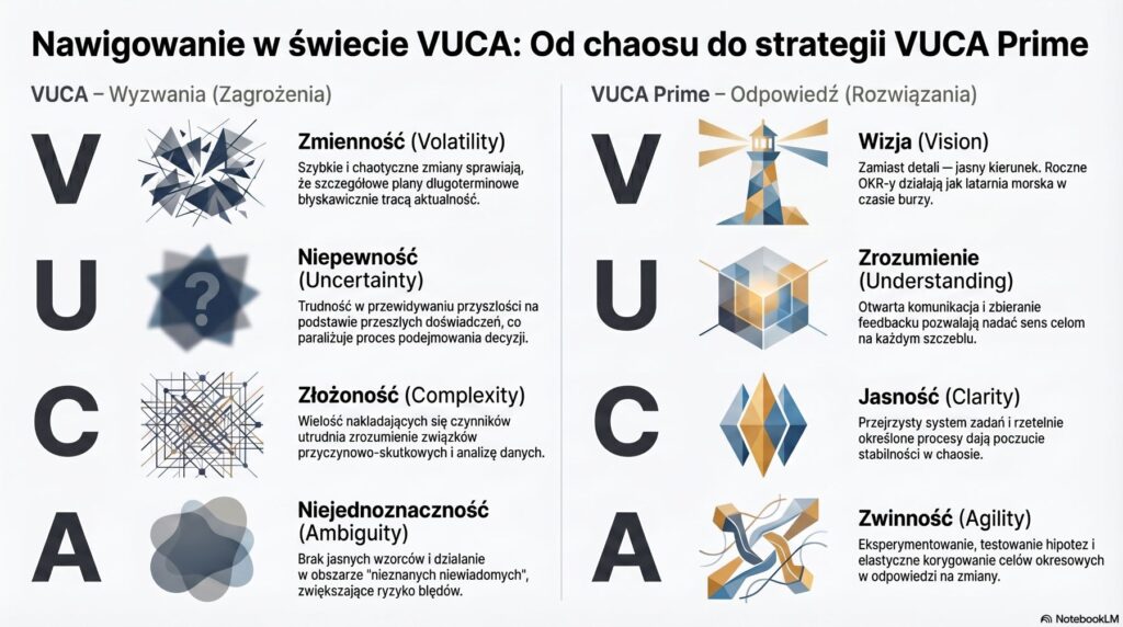 W świecie VUCA nie wystarczy mieć listy zadań. Potrzebne są cztery rzeczy: wizja, zrozumienie, jasność i zwinność. To one pozwalają menedżerom działać skutecznie mimo chaosu. W praktyce właśnie te cztery elementy pokazują, dlaczego OKR-y nie są modą, lecz sensownym sposobem pracy z celami.